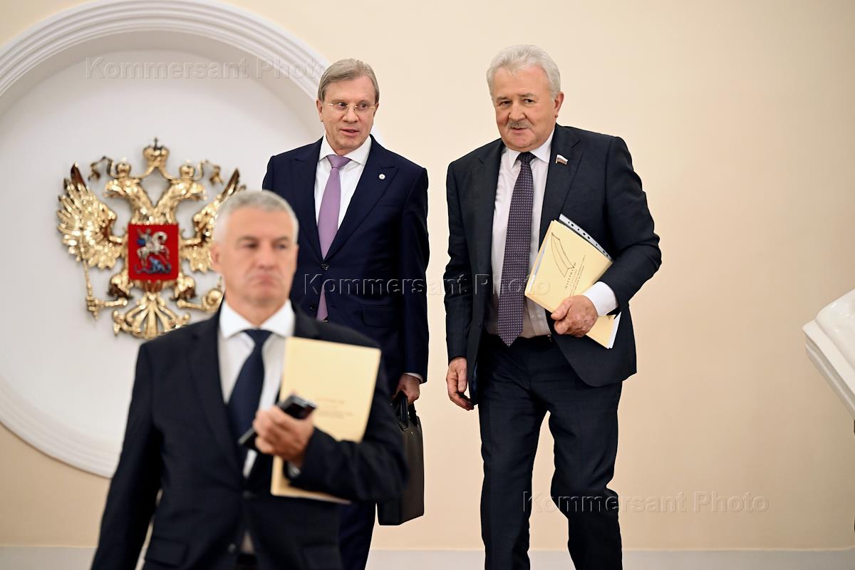 Заседание Президиума Государственного совета России по вопросам развития транспорта в Кремле. Слева направо: губернатор республики Карелия Артур Парфенчиков, министр транспорта России Виталий Савельев и председатель комитета Государственной думы России по транспорту и развитию транспортной инфраструктуры Евгений Москвичев после заседания.
