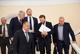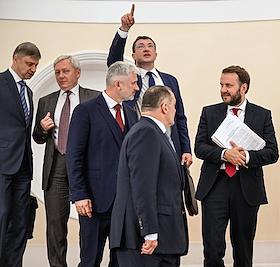 Заседание Президиума Государственного совета России по вопросам развития транспорта в Кремле. Слева направо: губернатор Алтайского края Виктор Томенко, министр строительства и жилищно-коммунального хозяйства России Ирек Файзуллин и губернатор Калининградской области Антон Алиханов после заседания.