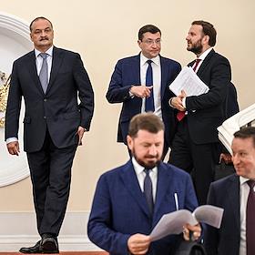 Заседание Президиума Государственного совета России по вопросам развития транспорта в Кремле. Слева направо: глава Республики Дагестан Сергей Меликов, губернатор Нижегородской области Глеб Никитин и помощник президента России Максим Орешкин после заседания.