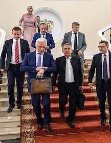 Заседание Президиума Государственного совета России по вопросам развития транспорта в Кремле. Слева направо: министр экономического развития России Максим Решетников, министр финансов России Антон Силуанов и мэр Москвы Сергей Собянин после заседания.