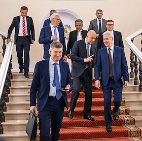 Заседание Президиума Государственного совета России по вопросам развития транспорта в Кремле. Слева направо: губернатор Курской области Роман Старовойт, генеральный директор ПАО "КАМАЗ" Сергей Когогин, министр экономического развития России Максим Решетников, глава Республики Татарстан Рустам Минниханов, министр финансов России Антон Силуанов, глава Чувашской Республики, председатель кабинета министров Чувашии Олег Николаев, мэр Москвы Сергей Собянин и губернатор Челябинской области Алексей Текслер после заседания.