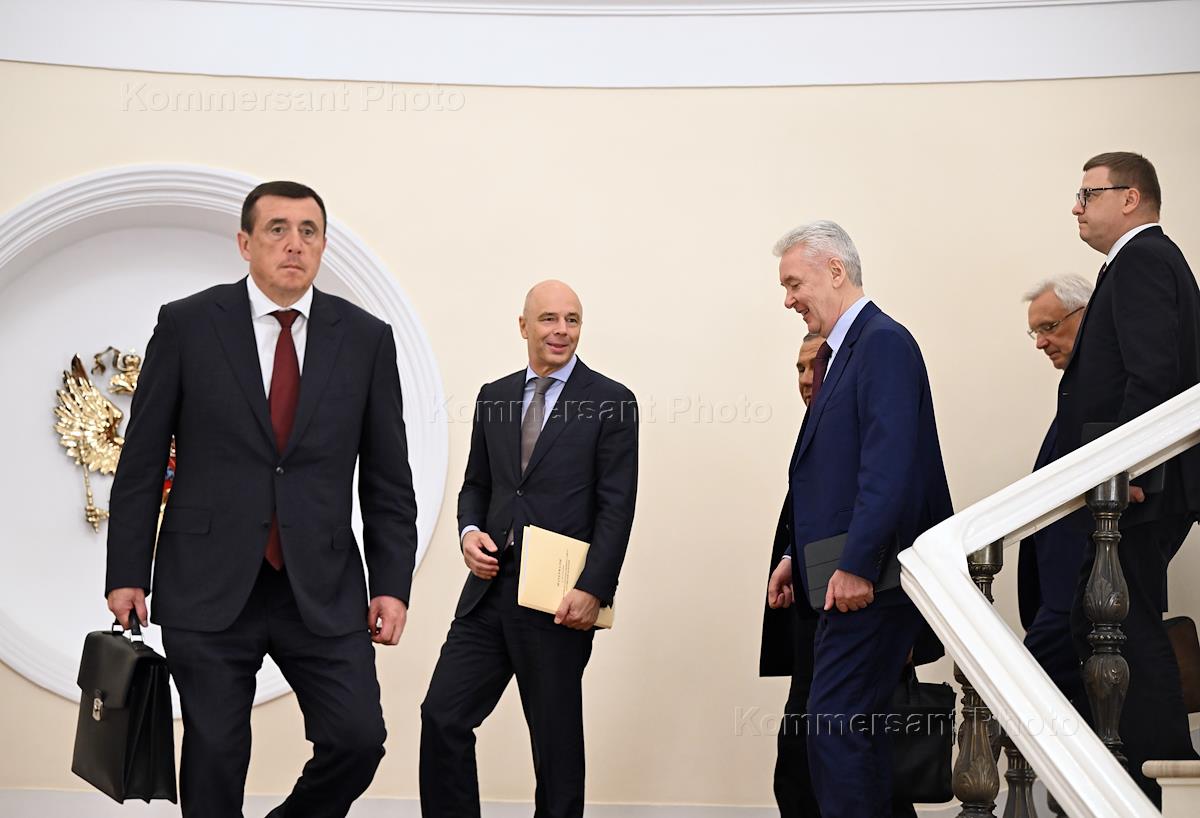 Заседание Президиума Государственного совета России по вопросам развития транспорта в Кремле. Слева направо: министр экономического развития России Максим Решетников, министр финансов России Антон Силуанов и мэр Москвы Сергей Собянин после заседания.