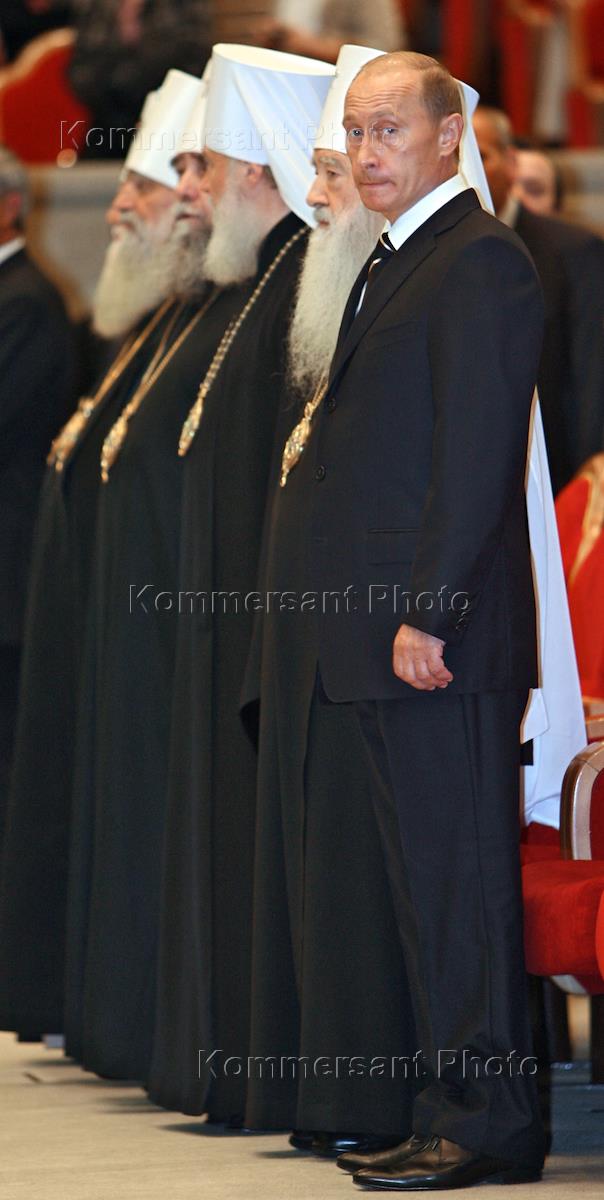 Слева направо: митрополит Екатеринодарский и Кубанский Исидор, митрополит Омский и Тарский Феодосий, митрополит Ташкентский и Среднеазиатский Владимир, председатель отдела внешних церковных связей Московского патриархата митрополит Смоленский и Калининградский Кирилл, митрополит Крутицкий и Коломенский Ювеналий и президент России Владимир Путин на праздновании 45-летия епископской хиротонии Патриарха Московского и всея Руси Алексия II. Празднование прошло в храме Христа Спасителя.