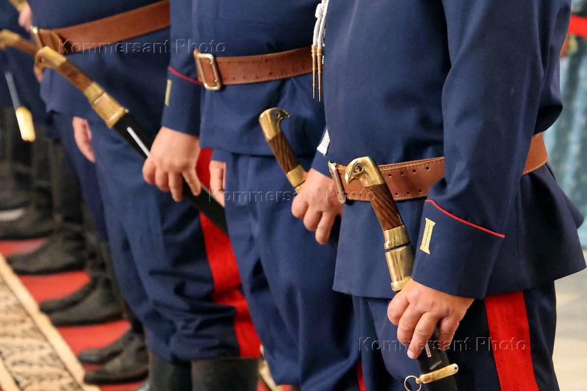 Торжественные мероприятия, посвященные 270-летию со дня рождения атамана Матвея Ивановича Платова. Богослужение и церемония вручения именного клинкового оружия (шашек) казакам Всевеликого войска Донского в Патриаршем Вознесенском войсковом всеказачьем соборе. Казаки во время церемонии.