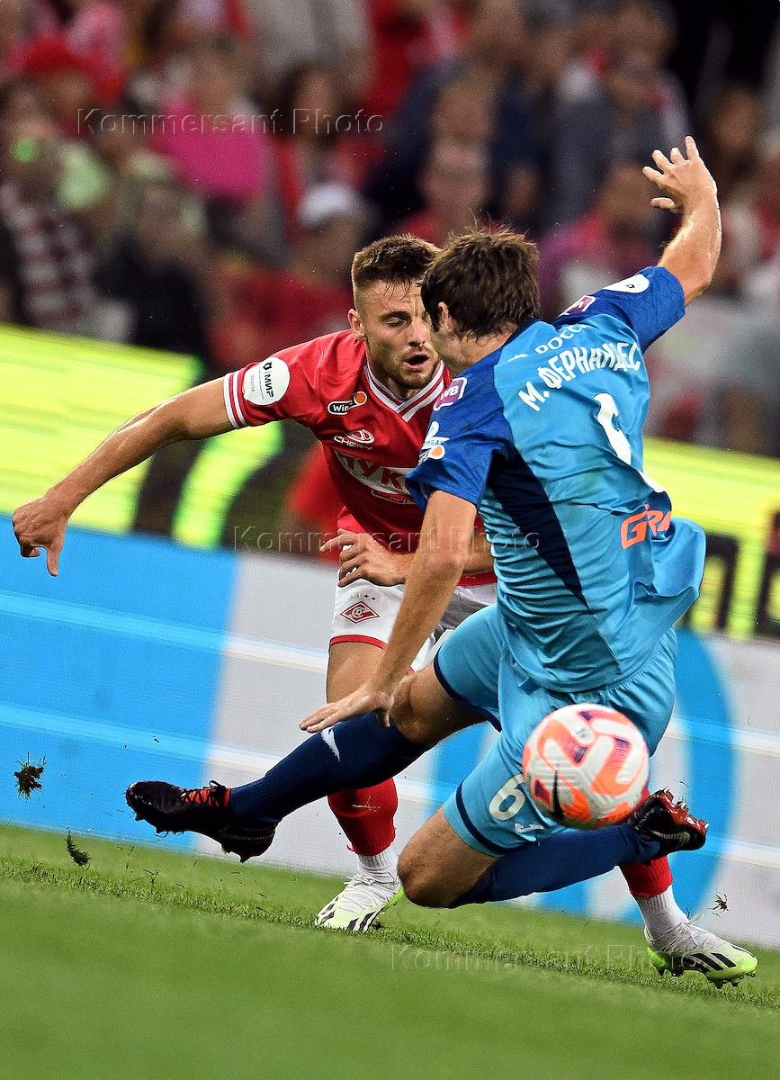 Российская Премьер-Лига (РПЛ). МИР - Чемпионат России по футболу 2023/2024. Пятый тур. Матч между командами "Спартак" (Москва) - "Зенит" (Санкт-Петербург) на стадионе "Открытие Банк Арена". Игрок команды "Спартак" Олег Рябчук (слева) во время матча.