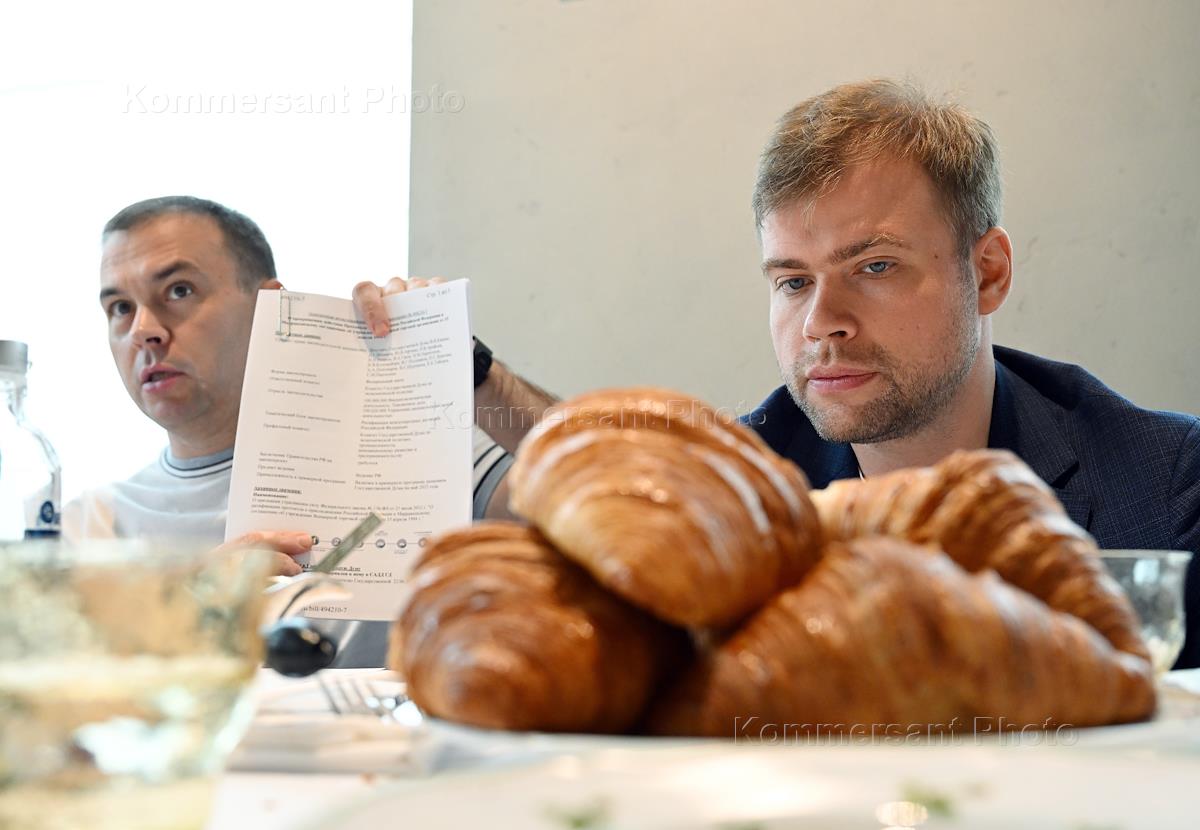 Пресс-завтрак с участием первого заместителя комитета Государственной думы России по безопасности и противодействию коррупции Юрия Афонина и кандидата в мэры Москвы от КРПФ, депутата Московской городской думы Леонида Зюганова в ресторане "Аврора". Первый заместитель комитета Государственной думы России по безопасности и противодействию коррупции Юрий Афонин (слева) и кандидат в мэры Москвы от КПРФ, депутат Московской городской думы Леонид Зюганов (справа) перед началом пресс-завтрака.