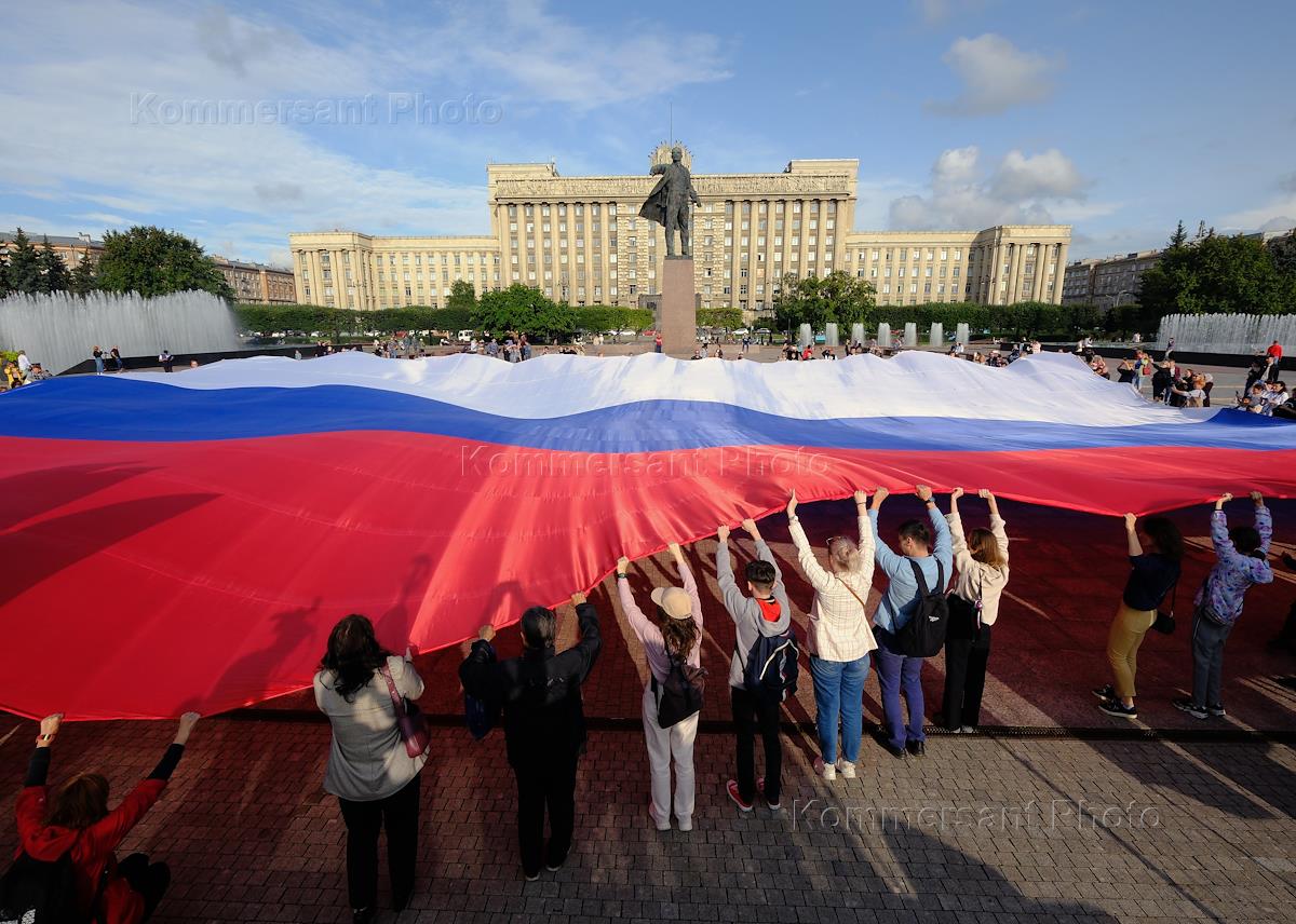 День Государственного флага России в Санкт-Петербурга. Мероприятия праздника на Московской площади. Участники мероприятия развернули 50-метровый флаг России.