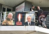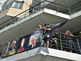 Стихийный мемориал, посвященный погибшему в авиакатастрофе главе ЧВК "Вагнер" Евгению Пригожину, на месте бывшего офиса ЧВК "Вагнер" на улице Ядринцевская в Новосибирске. Мужчины устанавливают флаг ЧВК "Вагнер" у портретов главы ЧВК "Вагнер" Евгения Пригожина и командира ЧВК "Вагнер" Дмитрия Уткина.
