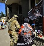Стихийный мемориал, посвященный погибшему в авиакатастрофе главе ЧВК "Вагнер" Евгению Пригожину, на месте бывшего офиса ЧВК "Вагнер" на улице Ядринцевская в Новосибирске. Мужчины устанавливают флаг ЧВК "Вагнер" у стихийного мемориала.