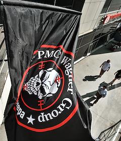 Стихийный мемориал, посвященный погибшему в авиакатастрофе главе ЧВК "Вагнер" Евгению Пригожину, на месте бывшего офиса ЧВК "Вагнер" на улице Ядринцевская в Новосибирске. Флаг ЧВК "Вагнер".