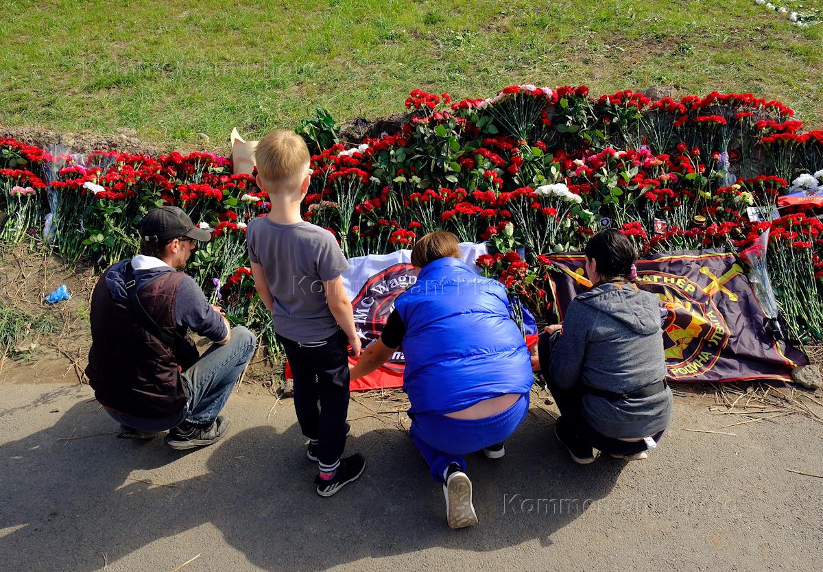 Стихийный мемориал, посвященный погибшему в авиакатастрофе главе ЧВК "Вагнер" Евгению Пригожину, перед бывшим офисом "ЧВК Вагнер Центра" на Зольной улице.