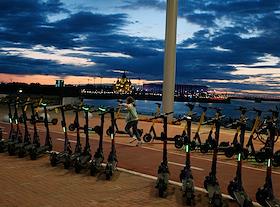 Международный фестиваль медиаискусства Intervals в исторической части Нижнего Новгорода. Жанровая фотография. Стоянка электросамокатов на набережной.