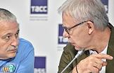 Конференция, приуроченная ко Дню Байкала в России, в пресс-центре ТАСС. Инструктор-космонавт-испытатель 1-го класса ОАО "Ракетно-космическая корпорация "Энергия" имени С.П.Королева" Федор Юрчихин (слева) и первый заместитель председателя комитета Государственной думы России по экологии, природным ресурсам и охране окружающей среды Вячеслав Фетисов (справа) во время пресс-конференции.