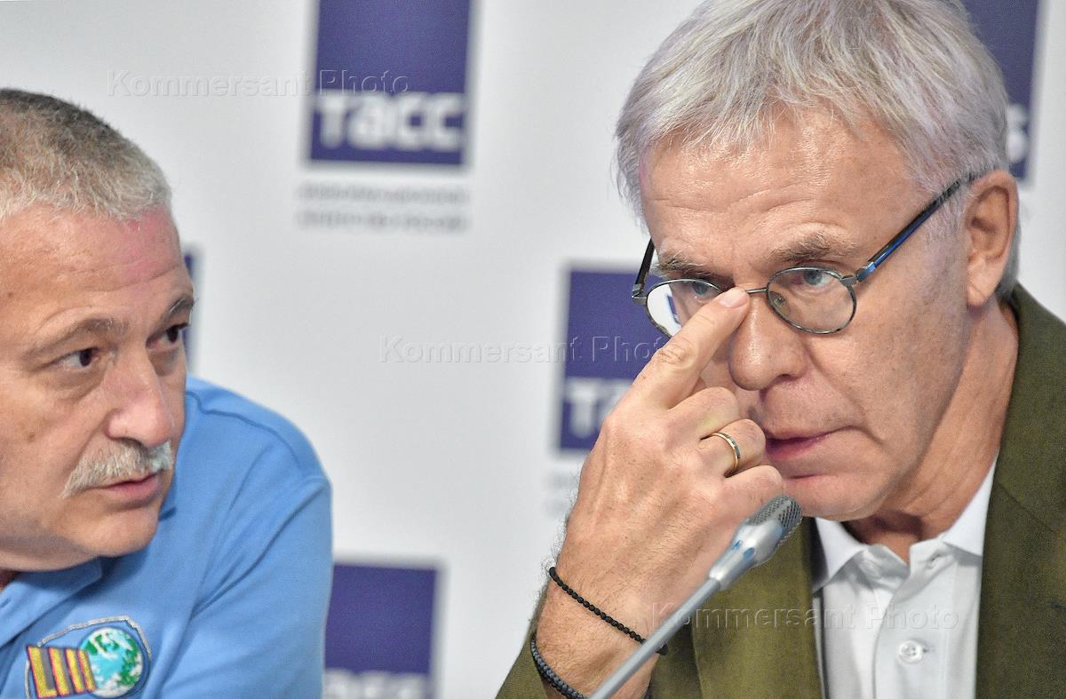Конференция, приуроченная ко Дню Байкала в России, в пресс-центре ТАСС. Инструктор-космонавт-испытатель 1-го класса ОАО "Ракетно-космическая корпорация "Энергия" имени С.П.Королева" Федор Юрчихин (слева) и первый заместитель председателя комитета Государственной думы России по экологии, природным ресурсам и охране окружающей среды Вячеслав Фетисов (справа) во время пресс-конференции.
