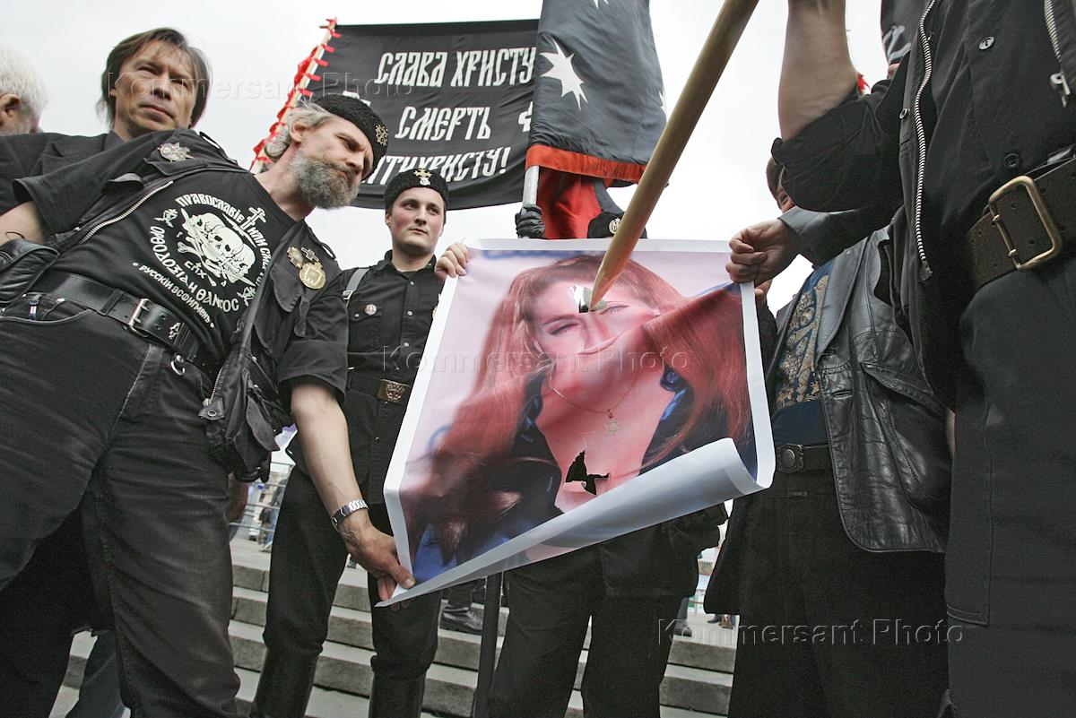 Активисты Союза православных братств и православных хоругвеносцев провели Акцию протеста на Пушкинской площади против концерта певицы Мадонны. Участницы Акции с иконами и плакатом "Так же как лже - Дмитриев, всяких лже - Мадонн из святой России вон!!!".
