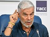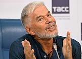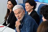 Пресс-конференция, посвященная результатам всероссийского проекта "Родники" в пресс-центре ТАСС. Певец Олег Газманов (в центре) во время пресс-конференции.