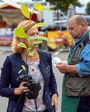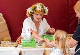 Международная агропромышленная выставка "Агрорусь-2023" в конгрессно-выставочном центре "Экспофорум". Жанровая фотография. Продавщица меда в венке из цветов на выставке.