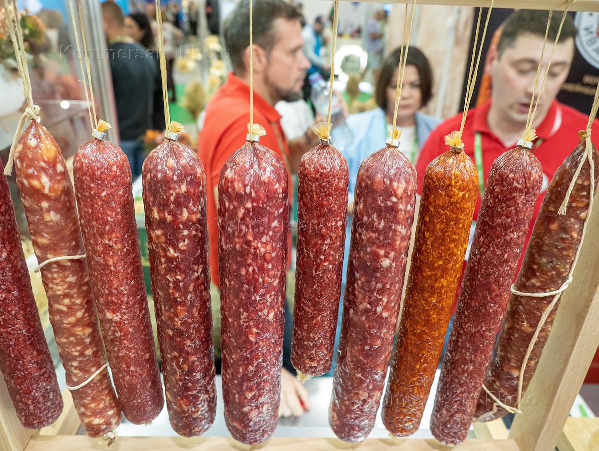 Международная агропромышленная выставка "Агрорусь-2023" в конгрессно-выставочном центре "Экспофорум". Жанровая фотография. Стенд с колбасной продукцией на выставке.