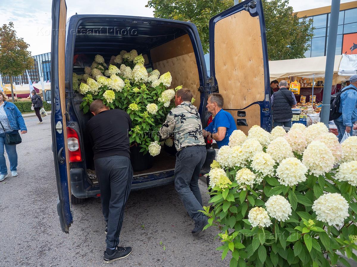 Международная агропромышленная выставка "Агрорусь-2023" в конгрессно-выставочном центре "Экспофорум". Жанровая фотография. Рабочие во время погрузки саженцев гортензии в автомобиль.
