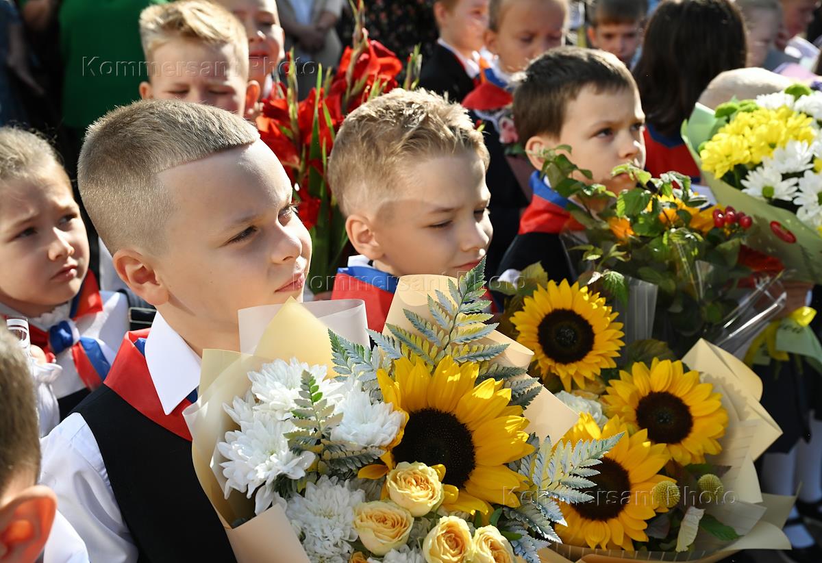День знаний (1 сентября). Жанровая фотография. Торжественная линейка в школе № 32. Букет цветов "1 сентября" на парте.