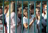 День знаний (1 сентября). Торжественная линейка, посвященная началу учебного года, в школе № 118. Жанровая фотография. Родители школьников за забором во время линейки.