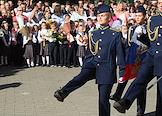 День знаний (1 сентября). Торжественная линейка, посвященная началу учебного года, в школе № 118. Жанровая фотография. Знаменная группа во время вноса государственного флага России.