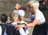 День знаний (1 сентября). Торжественная линейка, посвященная началу учебного года, в школе № 118. Жанровая фотография. Учитель с первоклассниками в классе после линейки.