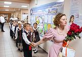 День знаний (1 сентября). Торжественная линейка, посвященная началу учебного года, в школе № 118. Жанровая фотография. Учитель и первоклассники во время линейки.
