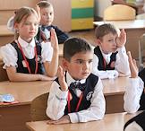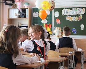 День знаний (1 сентября). Торжественная линейка, посвященная началу учебного года, в школе № 118. Жанровая фотография. Первоклассники в классе после линейки.