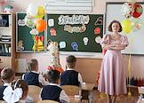 День знаний (1 сентября). Торжественная линейка, посвященная началу учебного года, в школе № 118. Жанровая фотография. Учительница и первоклассники в классе после линейки.