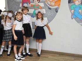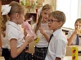Праздник "День знаний", посвященный началу нового учебного года, в школе № 18. Жанровая фотография. Учащиеся начальных классов в учебном кабинете во время перемены.