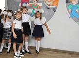 Праздник "День знаний", посвященный началу нового учебного года, в школе № 18. Жанровая фотография. Учащиеся начальных классов на перемене.