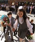 День знаний (1 сентября). Церемония открытия гимназии № 107 "Открытие" и торжественная линейка, посвященная началу учебного года, в Ново-Савиновском районе. Жанровая фотография. Учащиеся в школе после линейки.