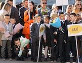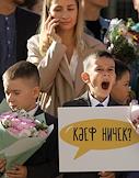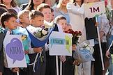 День знаний (1 сентября). Церемония открытия гимназии № 107 "Открытие" и торжественная линейка, посвященная началу учебного года, в Ново-Савиновском районе. Жанровая фотография. Первоклассники и их родители во время линейки.
