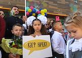 День знаний (1 сентября). Церемония открытия гимназии № 107 "Открытие" и торжественная линейка, посвященная началу учебного года, в Ново-Савиновском районе. Жанровая фотография. Первоклассники в школе после линейки.