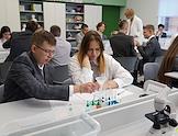День знаний (1 сентября). Церемония открытия гимназии № 107 "Открытие" и торжественная линейка, посвященная началу учебного года, в Ново-Савиновском районе. Жанровая фотография. Учащиеся в классе химии после линейки.