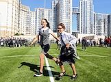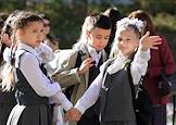 День знаний (1 сентября). Церемония открытия гимназии № 107 "Открытие" и торжественная линейка, посвященная началу учебного года, в Ново-Савиновском районе. Жанровая фотография. Учащиеся после линейки.