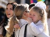 День знаний (1 сентября). Церемония открытия гимназии № 107 "Открытие" и торжественная линейка, посвященная началу учебного года, в Ново-Савиновском районе. Жанровая фотография. Первоклассница плачет на руках у мамы.