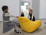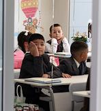 День знаний (1 сентября). Церемония открытия гимназии № 107 "Открытие" и торжественная линейка, посвященная началу учебного года, в Ново-Савиновском районе. Жанровая фотография. Первоклассники в классе после линейки.