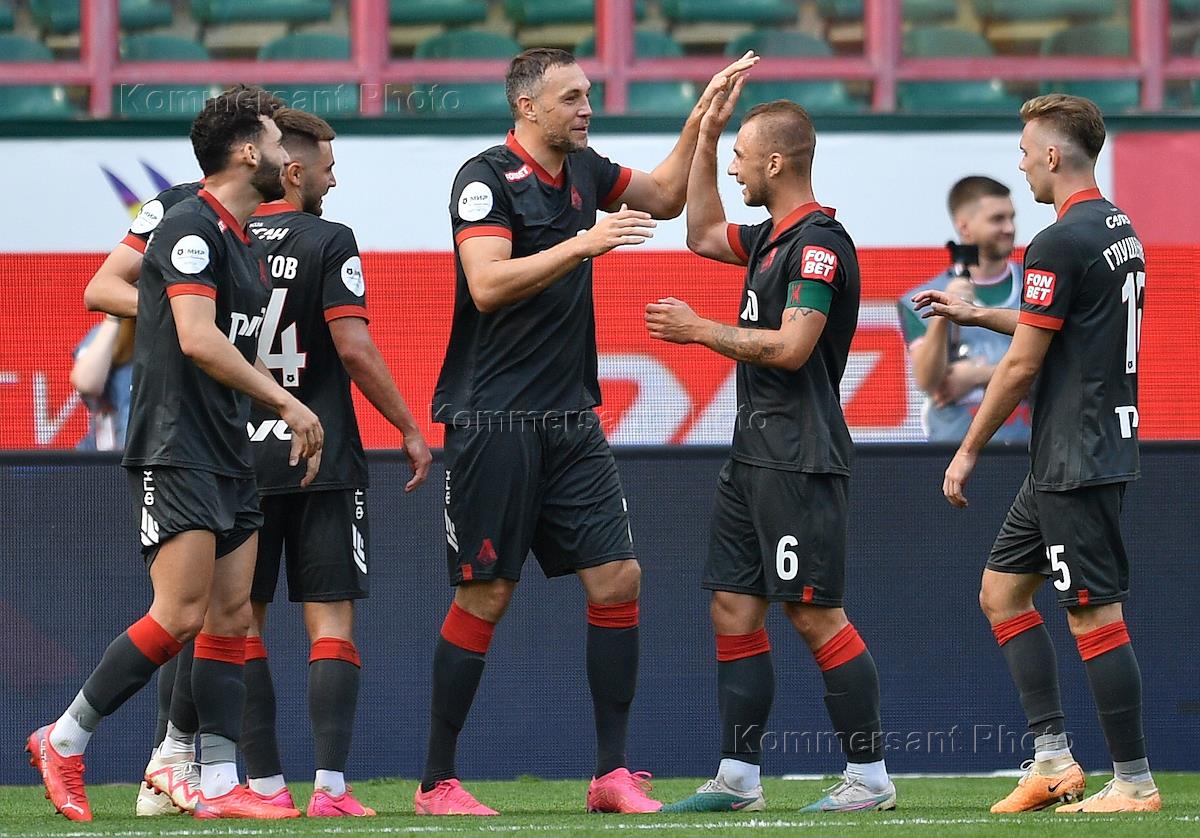 Российская Премьер-Лига (РПЛ). МИР - Чемпионат России по футболу 2023/2024. Седьмой тур. Матч между командами "Локомотив" (Москва) - "Балтика" (Калининград) на стадионе "РЖД Арена". Игрок команды "Локомотив" Артем Дзюба (в центре) во время матча.