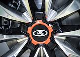 АО "АвтоВАЗ" (Волжский автозавод). Экспозиция корпоративного музея с образцами автомобилей выпущенных заводом. Логотип "АвтоВАЗ" на диске колеса автомобиля.