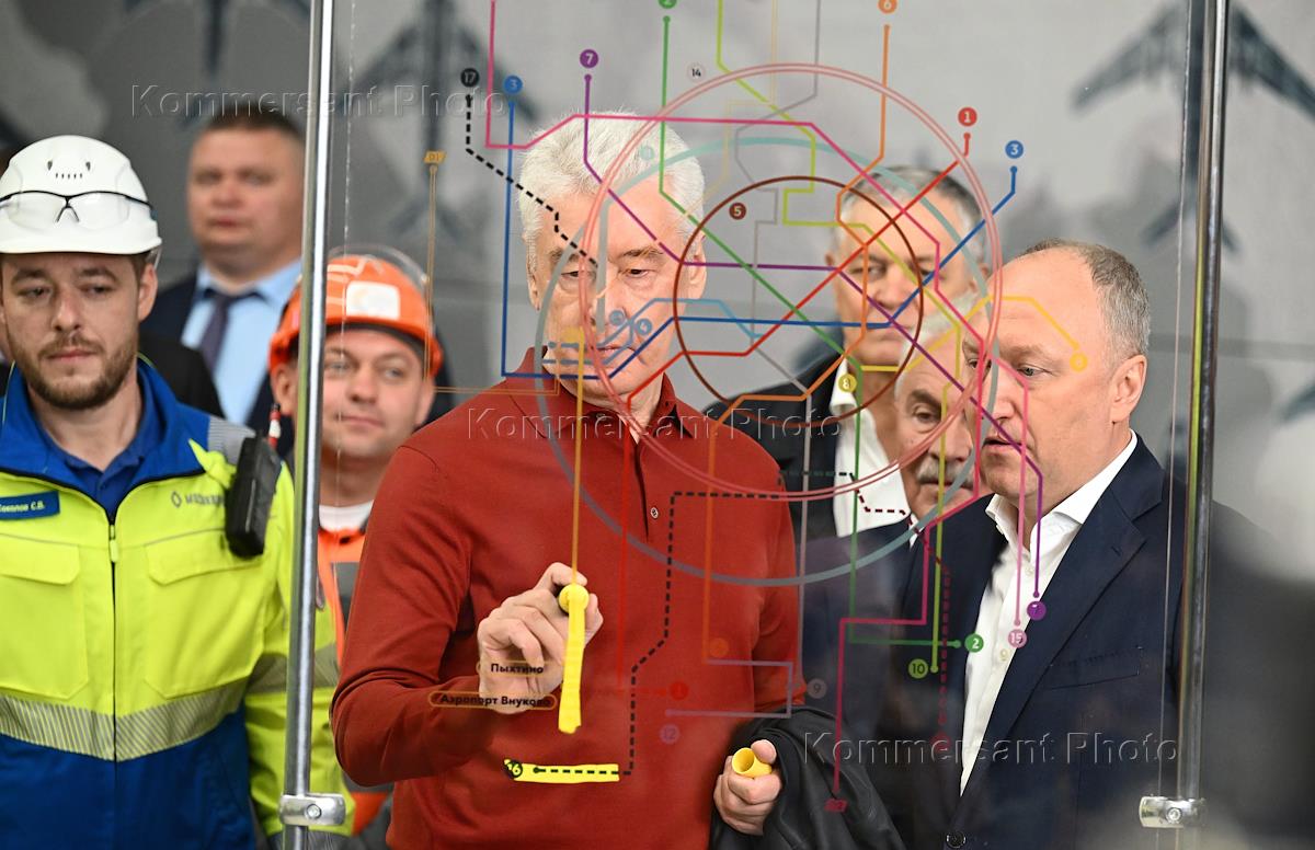 Церемония открытия станции метро "Аэропорт Внуково" и "Пыхтино" Солнцевской линии. Жанровая фотография. Схема "Развитие московского метрополитена до 2030 года".
