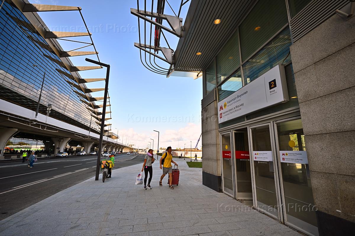 Церемония открытия станции метро "Аэропорт Внуково" и "Пыхтино" Солнцевской линии. Жанровая фотография. Пассажиры у станции метро "Аэропорт Внуково" вблизи здания аэропорта.