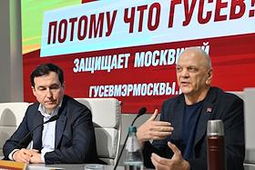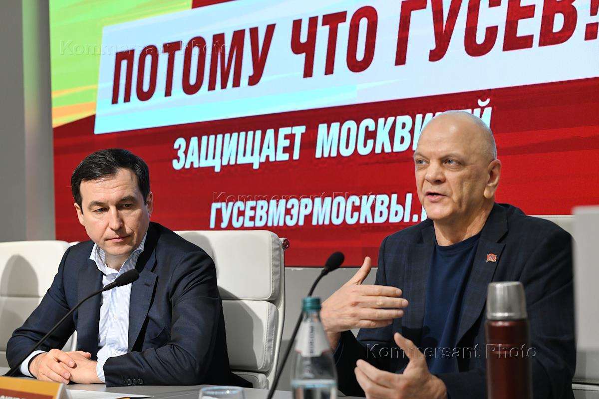 Первый заместитель руководителя фракции "Справедливая Россия - За правду" (СРЗП) в Государственной Думе России, председатель Совета регионального отделения партии СРЗП в Москве, кандидат в мэры Москвы Дмитрий Гусев (слева) и глава российского общественного движения (РОД) "Третья Сила", профессор московского института национальных и региональных отношений Игорь Скурлатов (справа) во время пресс-конференция в информационном агентстве "Аврора".