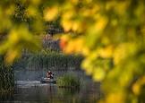 Виды Оренбургской области. Жанровая фотография. Рыбак на лодке во время ловли рыбы на реке Урал в Кувандыкском районе.