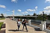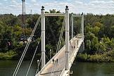 Виды Оренбурга. Жанровая фотография. Подвесной пешеходный мост проходит через реку Урал соединяет два континента - Европу и Азию, находящиеся на разных берегах реки.