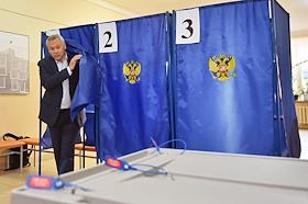 Единый день голосования (ЕДГ) -2023. Выборы губернатора Новосибирской области. Работа избирательных участков. Губернатор Новосибирской области Андрей Травников во время голосования на участке.