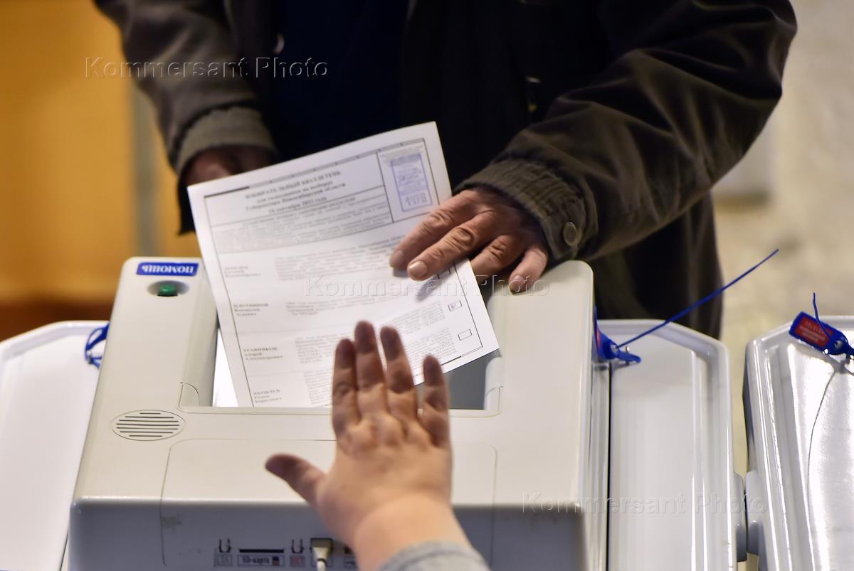 Единый день голосования (ЕДГ) -2023. Выборы губернатора Новосибирской области. Работа избирательных участков. Избиратель во время голосования.