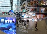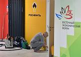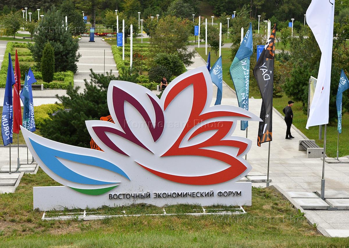 Восточный экономический форум (ВЭФ) 2023 на территории Дальневосточного федерального университета (ДВФУ) на острове Русский. Жанровая фотография. Подготовка к началу работы форума.