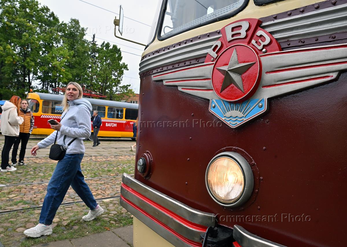 Торжественный парад трамваев, посвященный Дню города. Проезд моделей трамваев разных лет в районе ВДНХ.